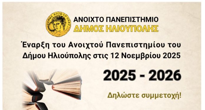 Ο Δήμος Ηλιούπολης ανακοινώνει με χαρά την επανεκκίνηση του θεσμού του Ανοιχτού Πανεπιστημίου, ενός σημαντικού προγράμματος διά βίου μάθησης που έχει αγαπηθεί από τους δημότες της πόλης. Η νέα περίοδος (2025–2026) ξεκινά την Τετάρτη 12 Νοεμβρίου 2025, στο Μουσείο Εθνικής Αντίστασης (Μαρίνου Αντύπα & Ελευθερίου Βενιζέλου), με ένα επίκαιρο και ιδιαίτερα ενδιαφέρον θέμα.