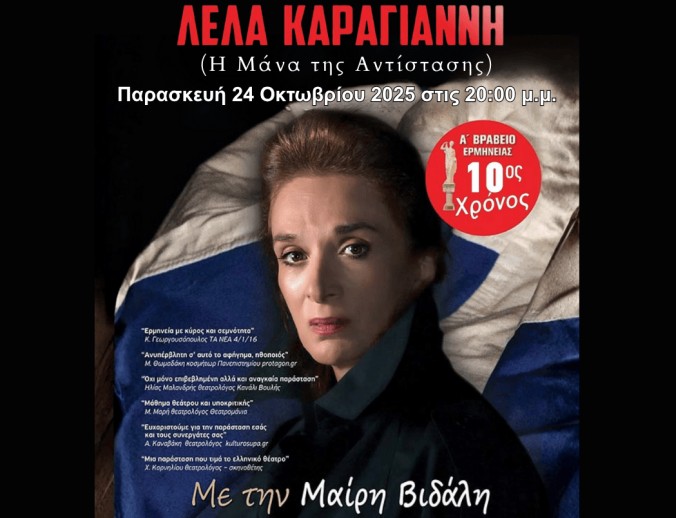 Ο Δήμος Ηλιούπολης σας προσκαλεί στην θεατρική παράσταση με τίτλο «ΛΕΛΑ ΚΑΡΑΓΙΑΝΝΗ Η Μάνα της Αντίστασης» που θα πραγματοποιηθεί με Ελεύθερη Είσοδο την Παρασκευή 24 Οκτωβρίου 2025 στις 20:00 μ.μ. στο Δημοτικό Θέατρο Ηλιούπολης «Μίκης Θεοδωράκης» (Λεωφόρος Σοφοκλή Βενιζέλου και Κουντουριώτου) στο Δημαρχείο της Ηλιούπολης.