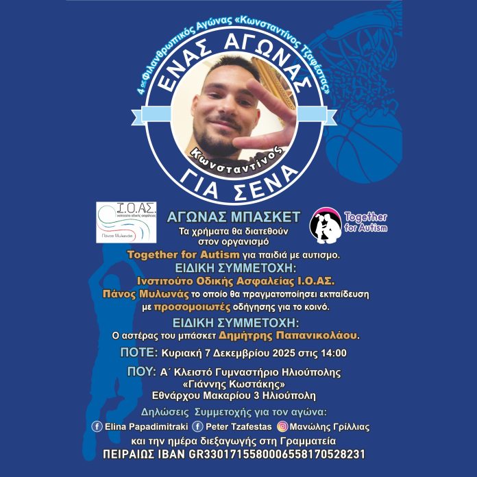 Ο Φιλανθρωπικός αγώνας Μπάσκετ θα διεξαχθεί στο Α‘ Κλειστό Γήπεδο Ηλιούπολης «Γιάννης Κωστάκης» (Εθνάρχου Μακαρίου 3 Ηλιούπολη) όπου υπήρξε και αθλητής ο Κωνσταντίνος Τζαφέστας και τα χρήματα που θα συγκεντρωθούν, θα διατεθούν στον οργανισμό «Together for Autism» για παιδιά με αυτισμό.