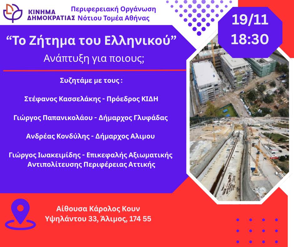 Ανοιχτή εκδήλωση-συζήτηση με θέμα τις επιπτώσεις του μεγάλου έργου του Ελληνικού διοργανώνει η Περιφερειακή Οργάνωση Νότιου Τομέα Αθήνας του «Κινήματος Δημοκρατίας».