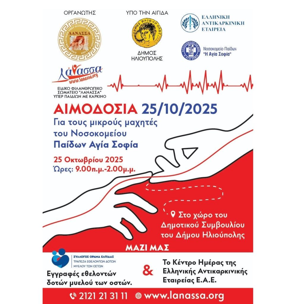 ΑΙΜΟΔΟΣΙΑ το Σάββατο 25 Οκτωβρίου 9.00 π.μ. – 14.00 μ.μ. στον χώρο του Δημοτικού Συμβουλίου του Δήμου Ηλιούπολης