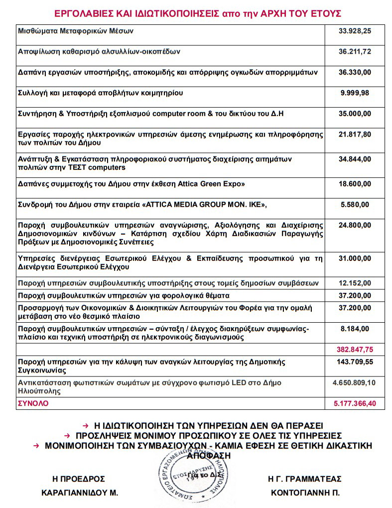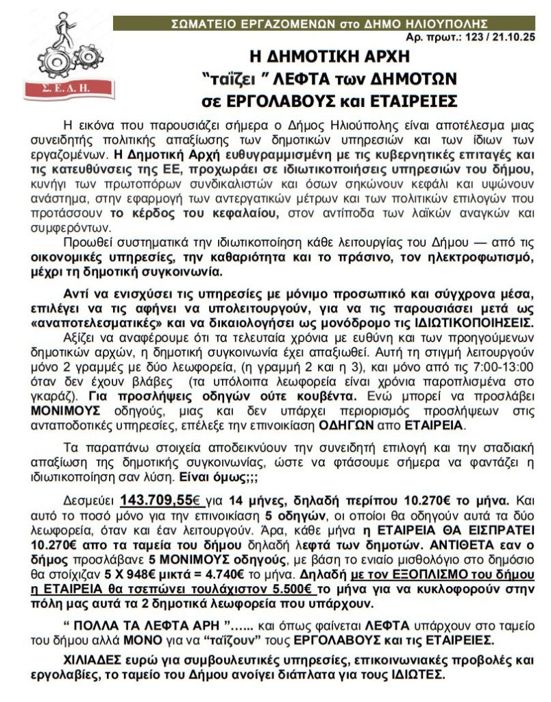 Με νέα ανακοίνωση το Σωματείου Εργαζομένων του Δήμου Ηλιούπολης, καταγγέλλει τη Δημοτική Αρχή για «συνειδητή απαξίωση» των δημοτικών υπηρεσιών και «προώθηση της ιδιωτικοποίησης» σε βασικές λειτουργείες του Δήμου.