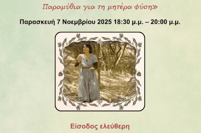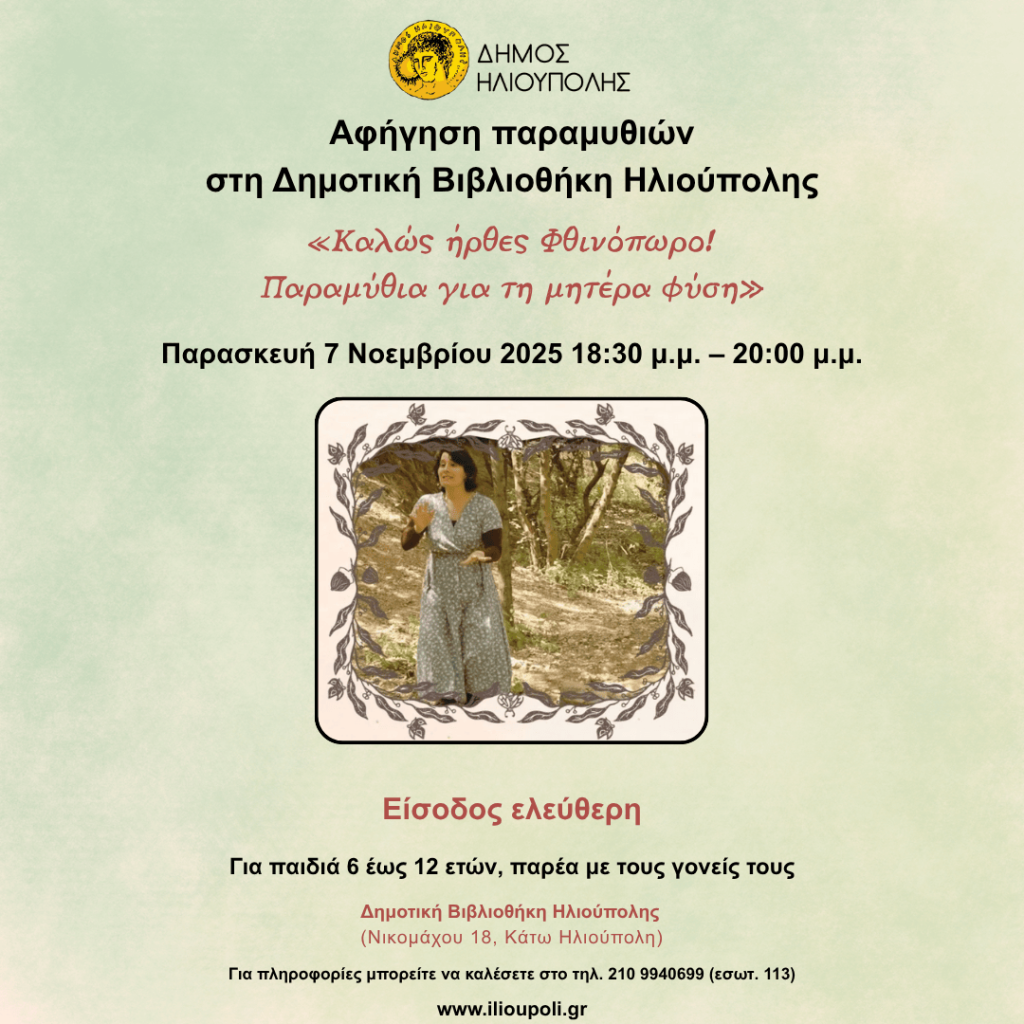 Την Παρασκευή 7 Νοεμβρίου 2025, από τις 18:30 έως τις 20:00, θα πραγματοποιηθεί η αφήγηση παραμυθιών με τίτλο